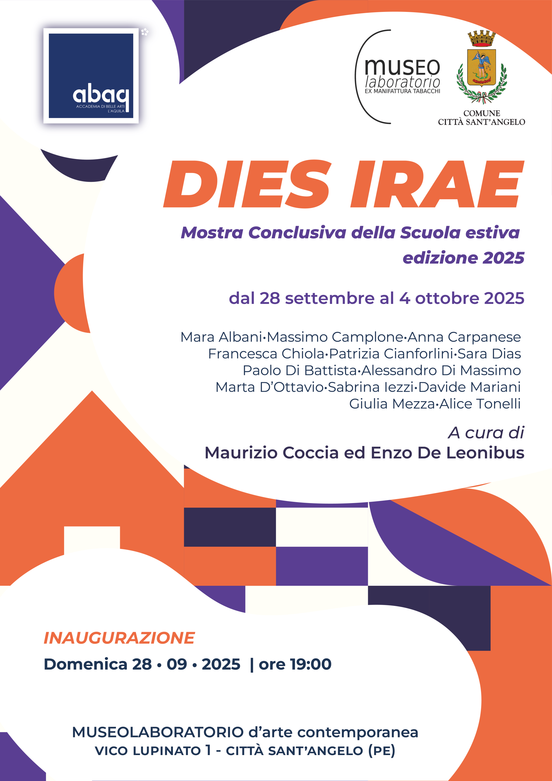 Dal 22 settembre il Museolaboratorio d’Arte Contemporanea di Città Sant’Angelo (PE), è lieto di ospitare DIES IRAE, la quinta edizione della Summer School, organizzata dall’Accademia di Belle Arti de L’Aquila.